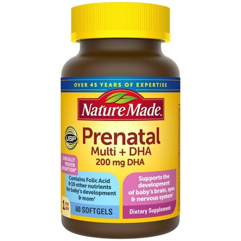Comprehensive prenatal vitamin softgel with 15 essential nutrients including dha folic acid and iron.